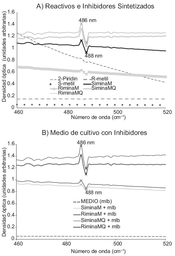 En la figura 1A, se observa el espectro de absorción de los reactivos 2-piridincarboxaldehido, Ä-metilbencilamina y S-metübencilamina, los cuales fueron empleados para sintetizar los inhibidores. También se detectan los máximos y mínimos de absorción característicos de los compuestos SiminaM, RiminaM, SiminaMQ y RiminaMQ recién sintetizados, a 486 y 489 nm.