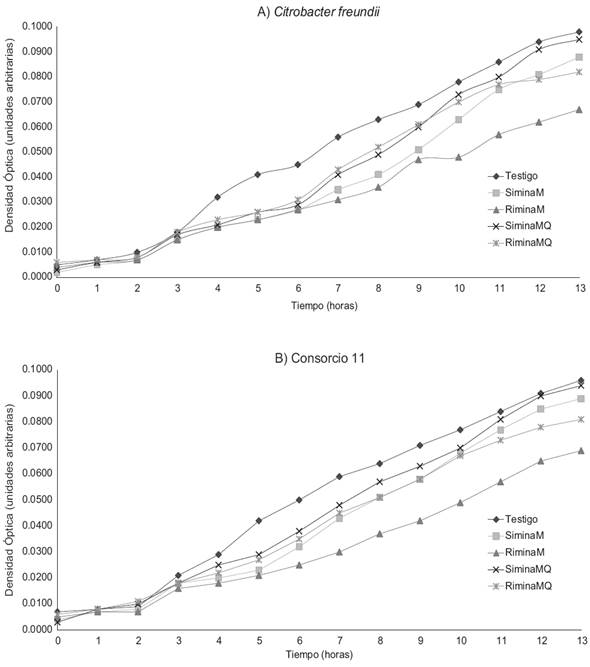 En las figuras 2A y 2B se muestran las curvas de crecimiento de Citrobacterfreundii y el consorcio 11 en presencia de los cuatro inhibidores de corrosión. Los valores de la densidad óptica a 600 nm muestran que el mayor crecimiento lo tuvieron los testigos que crecieron sin inhibidores. En cambio en los compuestos quirales disminuye, aunque es más inhibitorio en el caso de la RiminaM. Además, se observa que a las 24 h la curva de la SiminaM se aproxima a la del crecimiento de los testigos, por lo que es probable que el compuesto esté siendo metabolizado. Resultados similares se obtuvieron para el consorcio 22 (datos no mostrados).