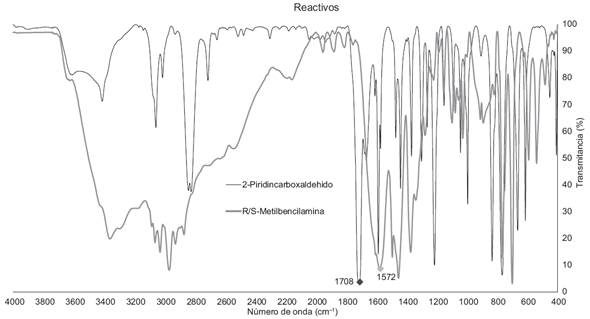 En la figura 3 se observa el espectro FTIR característico de los compuestos y los grupos funcionales que lo identifican. Para R-metilbencilamina y S-metilbencilamina se observa que tienen el mismo espectro cuya señal característica y distintiva para ambos es a 1572 cm, que distingue la unión amonio (C-NH2). El reactivo 2-piridincarboxaldehído tiene la señal distintiva del grupo aldehido a 1708 cm. Los inhibidores presentaron espectros similares, los cuatro isómeros mostraron la banda de vibración a 1646 cm-1 correspondiente al estiramiento C = N característico del grupo imino (Figs. 4A y B).