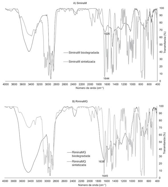 En las figuras 4A y B se presentan los espectros de FTIR que corresponden a SiminaM (A) y RiminaMQ (B), antes y después de ser biodegradados independientemente en los cultivos del consorcio 11. En estos se observan diferencias de transmitancia entre los compuestos biodegradados y los compuestos sintetizados. Sobre todo hay una reducción en la banda de vibración alrededor de 1646 cm de los inhibidores biodegradados, indicando que su concentración se redujo probablemente por la acción bacteriana.