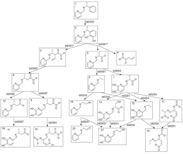 Este análisis in silico (Hou et al. 2003, Gao et al. 2010) con la base de datos de la Universidad de Minesota, permite visualizar cómo las iminas continúan íntegras en las dos etapas que siguen y que hipotéticamente se predicen, pues siguen apareciendo las señales (1640, 1635, 1642.1, 1639.1 cm) en los espectros de infrarojo aunque a menor concentración. Estas fases que siguen son la de la doble hidroxilación y la del rompimiento del anillo piridínico mediante dioxigenasas (Fig. 5, compuestos 3 a 6, 5 a 7). El mapa metabólico predice el rompimiento de los dos anillos aromáticos quedando productos simples y no contaminantes.