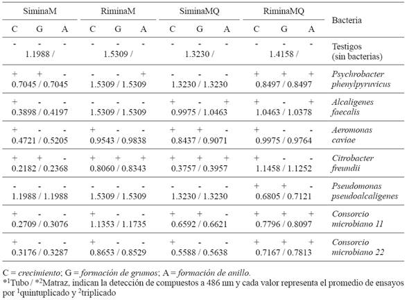 En el cuadro I se muestran cuatro datos relacionados con la biodegradación: el crecimiento bacteriano en mlb, la formación de anillo, la formación de grumos y la disminución en la densidad óptica (DO) del medio con los inhibidores que fueron degradados. Se observa que en el consorcio 22 hay crecimiento con los cuatro compuestos con formación de anillo y grumos con la RiminaMQ. Un ejemplo similar es la bacteria Aeromonas caviae, la cual creció en los cuatro inhibidores y sólo formó grumos en SiminaMQ.