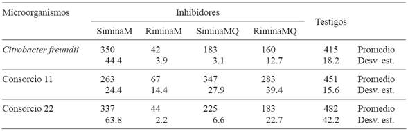 En el cuadro III se muestra la determinación de la biomasa bacteriana cuando crecieron únicamente en presencia del inhibidor RiminaMQ. Puede notarse que ambos valores del testigo (0.03700 y 0.00217) fueron inferiores al de Citrobacter freundii (0.05125 y 0.00757) y al del consorcio 22 (0.06089 y 0.00562) con el inhibidor RiminaMQ, lo que probablemente indica que el compuesto beneficia el crecimiento y proliferación de las bacterias porque éstas tienen la capacidad metabólica para emplearlos como posible fuente alterna de carbono y nitrógeno. En concordancia con los dos resultados anteriores, Citrobacter freundii muestra la mejor capacidad de biodegradación y adaptación a los inhibidores, seguida por los consorcios 11 y 22. Cabe mencionar que estos resultados se realizaron sin considerar la desviación estándar respectiva, debido a la cantidad limitada de inhibidores producidos pues la síntesis química se realizó a escala piloto y además también se emplearon en las pruebas de identificación.