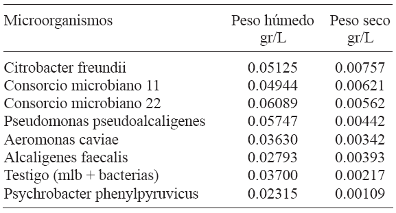 Pasados tres días de incubación en matraz se centrifugó el contenido y se desechó cuidadosamente el sobrenadante para obtener el botón o precipitado de bacterias con el que se obtuvo el peso húmedo, después se dejaron secar en una estufa a 35 °C durante 24 h y se pesó nuevamente para registrar el peso seco.