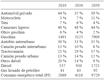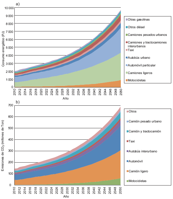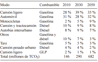 Entre 2010 y 2050 las emisiones del sector del autotransporte crecerán 370 %, de 146 a 682 Tg de CO2 (millones de toneladas de CO2). En 2050, 80 % de las emisiones del autotransporte provendrán de la quema de gasolina, 19 % del diésel y 1 % del GLP. Los automóviles y los camiones ligeros serán los principales causantes de las emisiones (Fig. 3b), siendo las motocicletas el segmento de mayor crecimiento en general y las camionetas el que más se expande dentro del segmento de automóviles. El autobús interurbano será el principal emisor de CO2 por quema de diésel para autotransporte (Cuadro VI).