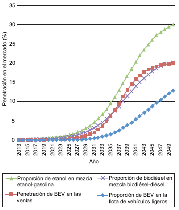 Se considera que la gasolina vendida en el país a partir de 2015 contiene etanol al 0.1 %, por lo que puede usarse sin problema en los motores convencionales. Se asume una penetración del biocombustible de manera análoga a la propuesta por Islas et al. (2007), una sigmoide que hace alcanzar en 2050 una mezcla al 30 % de etanol en la gasolina vendida en el país, coincidiendo en 2035 con el 8 % estimado por IEA (2012a). Se suponen emisiones neutras en carbono para la combustión del etanol, pero existen emisiones de CO2 derivadas del cambio de uso de suelo. Se toma como base a García y Manzini (2012) para estimar dichas emisiones, pues asumen que la caña de azúcar para etanol es cultivada en superficies que fueron pastizales y que se imponen restricciones para evitar la competencia con la producción de alimentos.