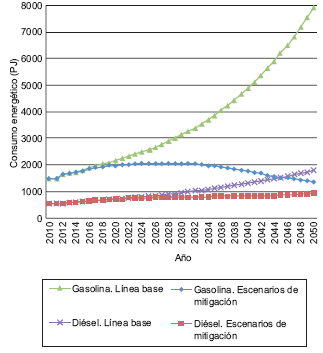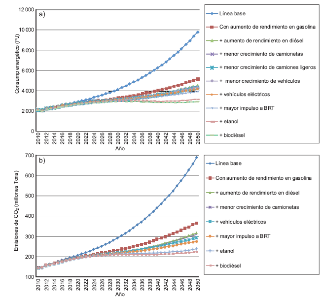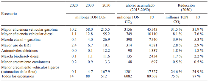 Ninguno de los esquemas modelados es suficiente, por sí sólo, para estabilizar el consumo energético y las emisiones de CO2. Cuando mucho (con el aumento de rendimiento en vehículos a gasolina) en 2050 se lograría evitar consumir 47 % de la energía del transporte en relación con el escenario base. La mezcla etanolgasolina aportaría 5.8 % de reducción, el uso de vehículos eléctricos 2.6 %, un mayor impulso a los sistemas BRT 2.5 % y frenar el crecimiento de camionetas de pasajeros para favorecer los autos subcompactos 0.9 %. Respecto a las emisiones asociadas a la quema de diésel, una mayor eficiencia vehicular produce una reducción de 6 % y el uso de biodiésel de 2 %.