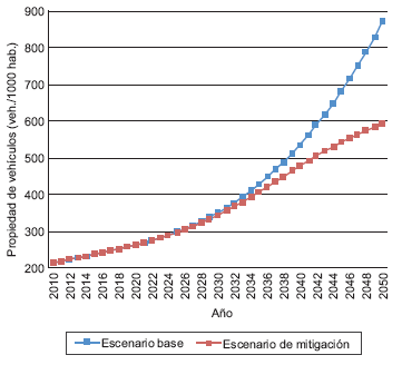 Se analiza el consumo energético del autotransporte y de sus emisiones de CO2 cuando la TMCA de la flota de vehículos ligeros (automóviles y camiones a gasolina) se reduce a partir de 2020. Con ello, esta flota crece con menor rapidez que bajo el escenario tendencial, alcanzándose la maduración y saturación del mercado gracias al efecto combinado de la desaceleración en ventas y del incremento de la tasa de desecho de vehículos. El objetivo de este escenario es determinar la expansión de la flota de vehículos que permite estabilizar las emisiones de CO2. Se asume una evolución sigmoide de la propiedad de vehículos como sugieren Dargay et al. (2007).