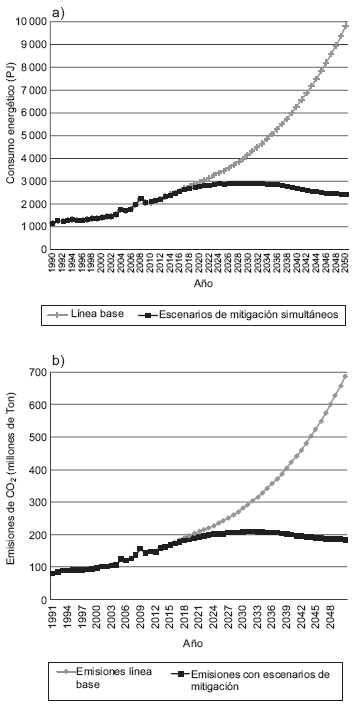 En caso de aplicar varios escenarios de mitigación simultáneamente, las emisiones de GEI evitadas no alcanzan las mismas proporciones que de manera aislada. Las interdependencias entre los escenarios provocan que los beneficios sean cada vez más difíciles de lograr (Fig. 5a y b). Esto no implica que sea preferible la aplicación de pocos esquemas de mitigación, todo lo contrario: para lograr la estabilización de emisiones se requerirá de un número mayor de medidas cuanto mayor sea el nivel alcanzado de emisiones. El resultado de la aplicación simultánea de los esquemas analizados es la reducción de 69 % del consumo energético y de 66 % de las emisiones de CO2 respecto al escenario base con un consumo de energía que alcanza un máximo de 2977 PJ en 2032. Sin embargo, dadas las altas TMCA en la mayoría de los segmentos automotrices, los esquemas de mitigación no soportan la presión y para los años posteriores el consumo energético se incrementaría, perdiéndose la breve estabilización. Si bien las emisiones de CO2 reducen en gran medida su crecimiento explosivo, nunca dejan de aumentar.