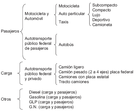 donde Et es el consumo energético total del autotransporte en el año t, Vijkt es la cantidad de vehículos de submodo i del año modelo k que usan el combustible j, Dijkt es la distancia anual recorrida en kilómetros, Iijkt es la intensidad de combustible del vehículo Vijk y Pcj es el poder calorífico. Los submodos del autotransporte (índice i en la ecuación) se proponen en la figura 1, los cuales permiten identificar el consumo del usuario final.