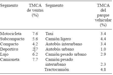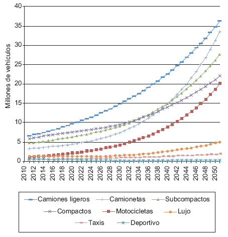 Las ventas anuales de vehículos nuevos, la entrada de vehículos usados desde Estados Unidos y la tasa de desecho vehicular son los principales fenómenos que definen el cambio en la población de vehículos. En 2010, los vehículos subcompactos y los compactos representaron la mayoría del mercado de los automóviles nuevos (36 % y 33 %, respectivamente). Sin embargo, la venta de camionetas muestra una TMCA mayor a la de los demás segmentos (Cuadro II). En promedio, la población de vehículos en México crecerá en el periodo de 2010-2050 con una TCMA de 4.5 %, pasando de 25.6 millones en 2010 a 87.6 millones en 2040 y a 151.7 millones en 2050. El índice de motorización cambiará de 145 en 2010, a 350 en 2040 y a 601 en 2050. Como comparación, en 2010 los Estados Unidos tuvieron un índice de motorización de 797 automóviles por cada 1000 habitantes, la comunidad Europea 593 y los países de ingreso medio-alto, a los que pertenece México, 98 (Cuadro III).