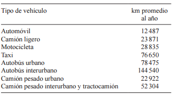donde Vit es la cantidad de vehículos del tipo i en el año t, VENi(t-1) son las ventas de vehículos en el año anterior a t, Git es la tasa media de crecimiento anual (TMCA) de las ventas, estimadas a partir de INEGI (2012b), Td es la tasa de desecho vehicular, es dependiente de la antigüedad m del vehículo y de su tipo i y se obtuvo de un análisis de la población vehicular reportada por Melgar (2007 y 2011). Los datos de los restantes tipos de vehículos se obtienen de las estadísticas de la Secretaría de Comunicaciones y Transportes (SCT), del Instituto Nacional de Estadística y Geografía (INEGI) y de Melgar (2007 y 2011). La distancia promedio anual recorrida Dikjt (Cuadro I) se deriva de Sheinbaum et al. (2010) y de las estadísticas de SCT ajustadas con datos de Gutiérrez y Soria (2011a y 2011b). La intensidad de combustible promedio para la flota en circulación se obtiene, por tipo de vehículo para 2011-2050 al ponderar los rendimientos de automóviles nuevos -obtenidos hasta el año-modelo 2011 de Sheinbaum y Chávez (2011), Davis et al. (2011), EPA-DOE (2002), INECC (2012) y a partir de 2011 proyectados con la tendencia histórica- con la estructura por edad del parque vehicular. El poder calorífico de los combustibles se toma como el promedio de 1990 a 2010 de lo reportado en el BNE (SENER 1997, SENER 2011).