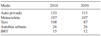 En 2006, 9.6 % de las personas que usaron el Metrobús que corre sobre la avenida Insurgentes lo hacía antes en automóvil, mientras que 5.8 % lo hacía en taxi (Power Mex 2013). Lo que representa 60 % de cambio modal de taxi a Metrobús respecto al cambio modal del automóvil. Este mismo factor se asume para 2050.