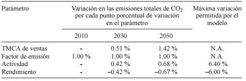 A largo plazo (hacia 2050), la variación de la TMCA de ventas influye de manera importante en las emisiones totales, pues incide en el crecimiento exponencial de la flota vehicular. La actividad vehicular y el rendimiento de combustible son preponderantes a mediano plazo (hacia 2030) y no pueden variar más allá de lo indicado en el cuadro VIII sin que el modelo lo detecte con consumos y emisiones negativas. De ahí que dichas cifras se asumen como los errores máximos del modelo, las cuales son semejantes a los valores definidos por defecto por el IPCC.
