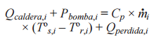 Donde Qcaldera,i corresponde al calor suministrado por la caldera a biomasa, Cp calor específico del agua, m • i es el flujo de masa, Tºs,i la temperatura de suministro de agua caliente (115 ºC), Tºr,i la temperatura de retorno de agua caliente (70 ºC), Qperdida,i el calor perdido en la red de distribución y Pbomba,i la potencia necesaria para distribuir el fluido a los consumidores, energía que se disipa en forma de calor (Sipilä et al. 2005).