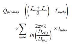 Donde Ts, Tr representa la temperatura de suministro y retorno respectivamente, Tsuelo la temperatura del suelo, correspondiente al promedio anual para la zona de 11.9 ºC según la información de la NASA2, conductividad del aislante del tubo λ = 0.024 W/mK, (Dex,j, Din,j) los diámetros externos e interno (m) del tubo aislado j.