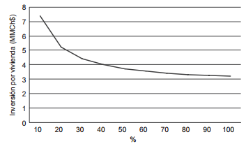 El sistema de calefacción distrital considera los costos de inversión, entre ellos: sistemas de caldera, red de distribución y adaptación en las viviendas. La red de distribución tiene una extensión de 5 317 m en la parte primaria y 9234 m de tuberías secundarias. La figura 2 presenta costos de inversión por vivienda decrecientes a medida que aumenta el grado de inserción de la calefacción distrital en los hogares.