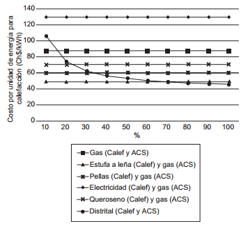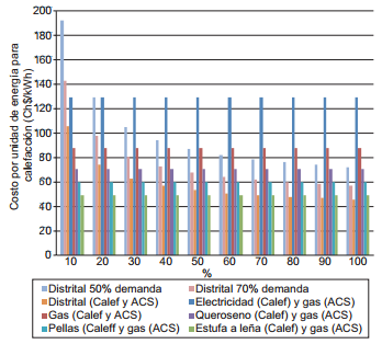 La figura 3 muestra una comparación de los costos de la unidad de energía entregado para satisfacer las necesidades de calefacción y agua caliente sanitaria8 mediante diferentes alternativas energéticas. Los resultados muestran que la calefacción + ACS entregadas por un sistema distrital presenta menores costos que otras alternativas cuando se alcanzan niveles de inserción superior al 70 %.