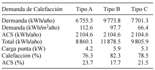 La zona de estudio abarca un total de 1826 viviendas ubicadas al sureste de la ciudad de Rancagua, los cuales se agruparon en tres tipos de viviendas con necesidades de calefacción según el nivel de aislación, el tamaño, el nivel socioeconómico y el valor de las viviendas (Cuadro I). Los requerimientos de energía fueron estimados según Bustamante et al. (2009), que consideran una temperatura de confort de 20 ºC para el día y 17 ºC para la noche al interior de las viviendas, en cuanto al agua caliente sanitaria (ACS) se estima un consumo de 160 L diarios a una temperatura de 45 ºC.