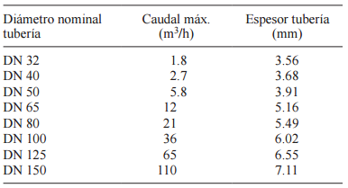 Donde los parámetros se consideran constantes a 90 ºC, densidad del agua ρ = 965.25 kg/m3, la rugosidad de las cañerías ε = 0.000045 m, la viscosidad dinámica μ ≈ 0.000315 Ns/m2.