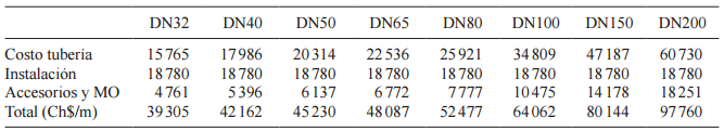 La inversión en la red de suministro (Cred) depende de los diámetros de tuberías y del tipo de terreno. El costo de accesorios y de mano de obra (MO) se estimó en 30 % del costo de la tubería (Yildirim et al. 2010), cuyos valores se muestran en el cuadro III.