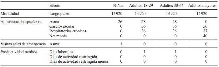El término Popk j × IRij corresponde simplemente al número de casos del efecto i, el cual se obtuvo del Instituto Nacional de Estadística (INE). Los casos son valorizados según el criterio de costo evitado en enfermedades y mortalidad prematura (Cuadro V).
