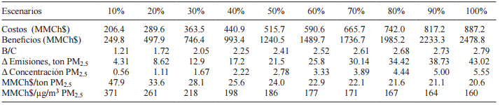 Los resultados del análisis (Cuadro VI) muestran que los beneficios sociales superan a los costos del proyecto en todos los escenarios de inserción del sistema de calefacción distrital. El análisis costoefectividad permite comparar diferentes medidas para la reducción de emisiones de material particulado, en el cuadro VII se comparan alternativas de subsidio a la oferta y la demanda de leña seca, diferentes niveles de recambio tecnológico y cambio de alternativas de calefacción por otras menos contaminantes.