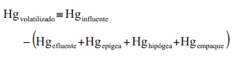 La masa total de mercurio acumulada en la parte aérea de las plantas (Hgepigea) se calculó al multiplicar la concentración del metal de cada muestra digerida (mg/kg), por su biomasa seca. La masa total en la parte radical (Hgvegetación hipogea) se determinó de la misma manera, al igual que la masa del mercurio total adherido al medio de empaque (Hgempaque). El mercurio volatilizado (Hgvolatilizado) se determinó teóricamente con la ecuación: