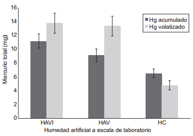 La figura 1 muestra la cantidad de mercurio acumulado y volatilizado en cada uno de los sistemas evaluados. Con base en los cálculos realizados, ingresaron 33.94 mg de mercurio, de los cuales el sistema con carrizo e inoculación bacteriana (HAVI) acumuló 11.14 mg (± 1.01 mg), seguido por los sistemas con carrizo sin inocular (HAV) con 9.08 mg (± 0.92 mg). Por último, los sistemas que presentaron menor acumulación fueron los que sólo contenían el medio de empaque (HC) con 6.5 mg (± 0.63 mg). El análisis estadístico evidenció diferencias significativas entre los tres sistemas (P < 0.05), en el que también se obtuvo como resultado que los sistemas con vegetación fueron diferentes al que se encontraba solamente empacado con tezontle. Esta similitud y mayor acumulación en los sistemas HAVI y HAV se relaciona con la capacidad de la vegetación para acumular metales pesados. Al respecto, Patra y Sharma (2000), Clemens et al. (2002) y Clemens (2006) mencionan que los MP se ligan con los ácidos carboxílicos (uniones a malato y citrato) y los exudados radicales, lo que permite que atraviesen las membranas de la raíz y del rizoma para después ser precipitados en la vacuola y posteriormente trasportados por el xilema hacia las hojas y los tallos. En estos órganos de las plantas el mercurio puede encontrarse como especie orgánica, ya sea como metilmercurio o dimetilmercurio. Esta última se caracteriza por su alta volatilidad (Mason y Sulivan 1998, Kabatas-Pendias y Pendias 2001), lo cual podría relacionarse con el hecho de que los sistemas HAVI y HAV hayan transferido mayor cantidad de mercurio a la atmósfera en comparación con el sistema HC que no contenía vegetación (Fig. 1).