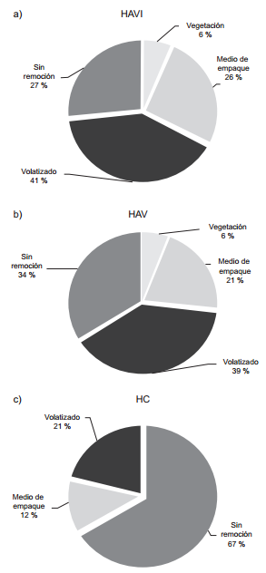Los cuatro posibles destinos del mercurio ingresado en los HA son la vegetación, el medio de empaque, la evapotranspiración y el mercurio no removido en el efluente, según lo reportan Stottmeister et al. (2003). Al respecto, en la figura 2 se indica la distribución del mercurio al término de los 304 días de operación. Los sistemas HAVI y HAV presentaron similitud estadística (P > 0.05) en todos los compartimentos evaluados (Fig. 2a y 2b), lo cual puede estar relacionado con la capacidad que tienen las macrófitas emergentes para acumular cationes independientemente de la densidad y diversidad bacteriana presente en el sistema (Weis y Weis 2004, Sheoran y Sheoran 2006). En contraparte, la capacidad de acumulación de metales pesados que exhibe el material de empaque se encuentra en función de la cantidad de microorganismos asociados o adheridos a él, ya que en conjunto dan lugar a un bioadsorbente con capacidad de realizar intercambio iónico con los metales (Akar y Divriklioglu 2010, Zhang 2011). En efecto, el HAVI acumuló 7 % más de mercurio que el HAV (Fig. 2a y 2b). Este último contiene microorganismos convencionales asociados a la rizósfera, por lo que pudieron verse inhibidos y por ello, tener una menor capacidad de bioadsorción en comparación con los utilizados en el HAVI, tal y como lo describen Von Canstein et al. (1999) y Teitzel y Parsek (2003).