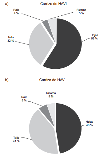 La figura 3 muestra la distribución del mercurio acumulado en los carrizos de los sistemas HAVI y HAV. La raíz y el rizoma constituyen la sección radical de la planta en las que no se encontraron diferencias entre los dos HA (P > 0.05). No obstante, tanto la cantidad de mercurio en el tallo como en las hojas fue diferente de manera significativa para los dos HA (P < 0.05). En la figura 3a se señala que el HAVI acumuló significativamente mayor cantidad del metal en las hojas que en el tallo (P < 0.05). Por su parte, en la figura 3b se indica que la vegetación presente del HAV acumuló 48 % de mercurio en las hojas y 41 % en el tallo, sin diferencias significativas entre los dos (P > 0.05).