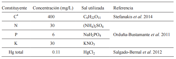 Los nueve HA operaron durante 304 días con alimentación discontinua (por lotes) de agua sintética cada cuatro días. La composición de esta agua de alimentación fue similar a la composición de aguas residuales municipales, con la adición de mercurio (Cuadro I).