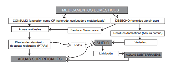 Existen dos rutas principales de entrada de CF al ambiente. La primera de ellas la constituye el consumo de los medicamentos, ya que los mismos una vez absorbidos están sujetos a una serie de reacciones donde una cierta cantidad del CF (en forma inalterada) y sus productos de degradación biológica (metabolitos) son excretados y terminan en las redes cloacales que los conducen finalmente a las plantas de tratamiento de aguas residuales (PTAR; Fig. 1). La proporción del CF no metabolizado va a depender de su estructura, dosis y mecanismo de acción, así como de la condición de cada individuo para metabolizar la droga, la cual está a su vez asociada con su edad, género y estado de salud. Un estudio realizado por Jjembra (2008) clasificó a algunos fármacos (según el porcentaje de excreción del compuesto activo inalterado) en: bajo (≤ 5 %), moderado bajo (6 – 39 %), relativamente alto (40 - 69 %) y alto (> 70 %). Otro factor que regula la introducción de CF por esta vía es la eficiencia en las PTAR. En una revisión realizada por Miége et al. (2009) clasificaron los CF según su eficiencia de remoción en PTAR a nivel mundial en dos grupos: 1) Altos valores de remoción (%R > 80 %) y 2) Bajos valores de remoción (%R < 30). Los resultados de esta revisión permiten inferir que muchos fármacos son persistentes en el ambiente ya que son resistentes a los procesos convencionales de regeneración de aguas residuales, distribuyéndose entre la fracción disuelta y los sólidos (lodos). Lo anterior dependerá de las características particulares de cada fármaco (solubilidad, constante de acidez, coeficiente de partición octanol-agua, biodegradabilidad) y de las condiciones operacionales de las PTRA.