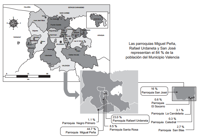 Se elaboró una encuesta utilizando preguntas cerradas y con opciones de posibles respuesta en una combinación de formato binario y múltiple. Dicha encuesta se aplicó de enero a julio de 2014 a las comunidades de las parroquias Miquel Peña, Rafael Urdaneta y San José, ya que representan las entidades más pobladas del Municipio Valencia que cuenta con 829 856 habitantes (INE 2013; Fig. 2). Los indicadores valorados en la encuesta se muestran en el cuadro I. Adicionalmente, se solicitó información acerca de la edad y género de los integrantes del grupo familiar del encuestado, así como el sector donde viven con el fin de evaluar la situación socioeconómica de la población analizada.