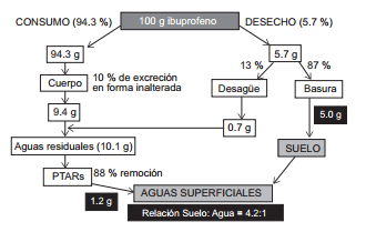 Se estableció, según resultado de las encuestas, que el 40 % de las medicinas almacenadas se consumen después y el resto se desechan, por lo que el consumo total asciende a 94.3 % (94.3 g) y el desecho se ubica en 5.7 % (5.7 g; Cuadro III). Debido a que sólo se excreta el 10 % del ibuprofeno en forma inalterada, ésto deja 9.4 g que se introducen al sistema de aguas residuales (Fig. 4). Cuando se combinan con los 0.7 g que se descargan a través de sanitarios y/o lavamanos se traduce en un total de 10.1 g que entra a la PTAR, dónde el 88 % se remueve, por lo que llegan 1.2 g a las aguas superficiales. De los 5.7 g desechados, 5 g llegan a los vertederos, es decir cuatro veces la cantidad que se descarga en el efluente de las PTAR (relación suelo: agua = 4.2:1). En este caso, el desecho representa una vía importante de contaminación del suelo, principalmente debido a la baja cantidad de fármaco excretado, a la alta eficiencia de remoción en PTAR y a la alta proporción de los medicamentos AINEs que son eliminados junto con otros desechos domésticos.