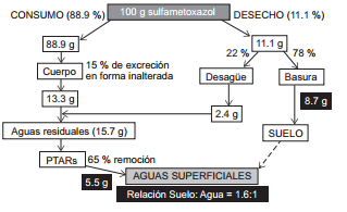 En el caso del sulfametoxazol, los resultados de la encuesta mostraron que un número menor de personas consume antibióticos (88.9 %) y se desecha una cantidad mayor (11.1 %), pero se obtiene una relación suelo:agua menor (1.6:1; Fig. 5). Lo anterior refleja una menor afectación del suelo en comparación con el agua, ya que a pesar de presentar un porcentaje de excreción comparable con el ibuprofeno, es más resistente a los procesos de regeneración de aguas residuales. Por otra parte, se observó una mayor tendencia al desecho de antibióticos a través del desagüe. En el cuadro IV se presenta la estimación de la relación suelo:agua para los otros fármacos, en la que se aprecian diferencias derivadas de sus porcentajes de excreción y remoción en PTAR, así como de los patrones de consumo y desecho obtenidos de los grupos farmacológicos a los cuales pertenecen.
