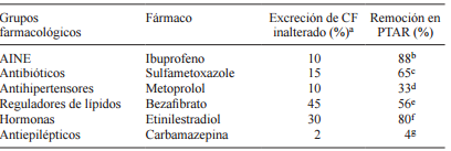 Respecto a las características intrínsecas de cada fármaco, las variables que se tomaron en consideración son el metabolismo y la estabilidad del CF en las PTAR. Es importante acotar, que en el afluente de las PTAR puede encontrarse además del CF excretado en forma inalterada, los metabolitos y los compuestos de conjugación con cada uno de ellos. Tales productos de conjugación por la acción de enzimas y microorganismos presentes en las PTAR, pueden sufrir reacciones de hidrólisis que liberan la fracción del metabolito o CF, lo que propicia un incremento en su concentración (Ternes 2001). Esta situación ha sido detectada en varias PTAR a nivel mundial, en las que los niveles de ciertos fármacos son mayores en el efluente que en el afluente (Miége et al. 2009).
