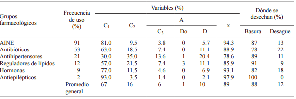 Respecto a los grupos farmacológicos, los antieplilépticos, AINEs y hormonas son los grupos que más se consumen sin dejar sobrantes (C1), mientras que los antibióticos (63 %), los reguladores de lípidos (57 %) y los antihipertensores (30 %) presentaron valores preocupantemente menores (Cuadro III). También se aprecia que a medida que disminuye el consumo total (CT), aumenta la cantidad de medicamentos desechados, principalmente debido a falta de programas de recolección y a la poca cultura de donación de medicamentos antes de su vencimiento o deterioro. Para los seis grupos farmacológicos, el método de eliminación más popular es junto con los desechos domésticos (88 %) y en menor proporción a través de lavamanos o sanitarios (desagüe). Esta segunda vía es una fuente importante de contaminación especialmente en el caso de los antibióticos, hormonas y analgésicos, posiblemente porque muchos de ellos se distribuyen en presentaciones líquidas y en el caso de las hormonas por razones culturales a fin de ocultar posibles tratamientos anticonceptivos en adolescentes.