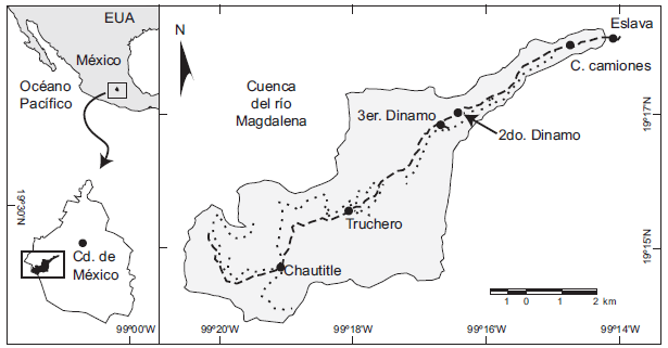 Área de estudio. El río Magdalena está localizado en la provincia morfo tectónica de la Faja Volcánica Trans mexicana (Ferrusquía-Villafranca, 1998) en el Parque Nacional Los Dinamos, Delegación Magdalena Contreras, Ciudad de México (19º 16’ 00’’ N - 99º18’ 22’’ O). Nace a una elevación de 3650 msnm y se extiende 21.6 km hasta los límites de la zona urbana de la Ciudad en donde se presentan numerosos aportes con descargas urbanas, las que se canalizan al drenaje profundo (Fig. 1). El clima de la región es templado sub húmedo, con abundantes lluvias durante junio a octubre y una época seca de noviembre a mayo (García 2004). Los cuerpos rocosos están constituidos por paquetes de rocas alternantes de lavas andesíticas abasálticas (Ferrusquía-Villafranca 1998) y la diversa topografía de la cuenca ha favorecido la presencia de una abundante vegetación de pino Pinus hartwegiiLindl. En la parte alta de la cuenca, de oyamel Abiesreligiosa (Kunth) Schltdl. y Cham. en la parte media y de encinos Quercus spp. y bosque mixto en la porción baja de la cuenca (Ávila-Akerberg 2010).
