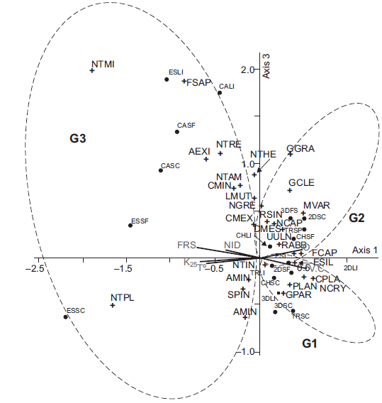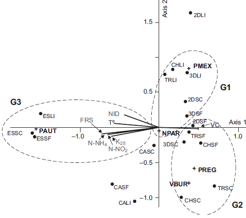 La ordenación de las algas con crecimiento visible. El ACC mostró una correlación de factores físicos y químicos con la distribución y la abundancia de algas similar a la observada para las diatomeas (Fig. 3). El primer eje explicó el 78 % de la varianza. La relación entre la distribución de las especies y los parámetros fisicos y químicos fue significativa a un eje (p = 0.01) y formó dos grupos, el primero de los cuales contenía Phormidium autumnale, que fue encontrado en los sitios que tienen los valores más bajos de oxígeno disuelto y velocidad de corriente (G3). El segundo grupo estuvo integrado por Nostoc parmelioides, Placoma regulare, Prasiola mexicana y Vaucheria bursata las cuales fueron registradas en las aguas más oxigenadas del río (G1-G2). El segundo eje con 12 % de la varianza explicada relacionó especies en función de los nutrientes y de los gradientes de temperatura (Fig. 3), la asociación de Phormidium autumnale a los sitios de mayor NID y Nostoc parmelioides, Placoma regulare, Vaucheria bursata y Prasiola mexicana a los sitios que tienen una menor concentración de nutrientes en la cuenca media (3D y 2D) y alta (CH y TR).