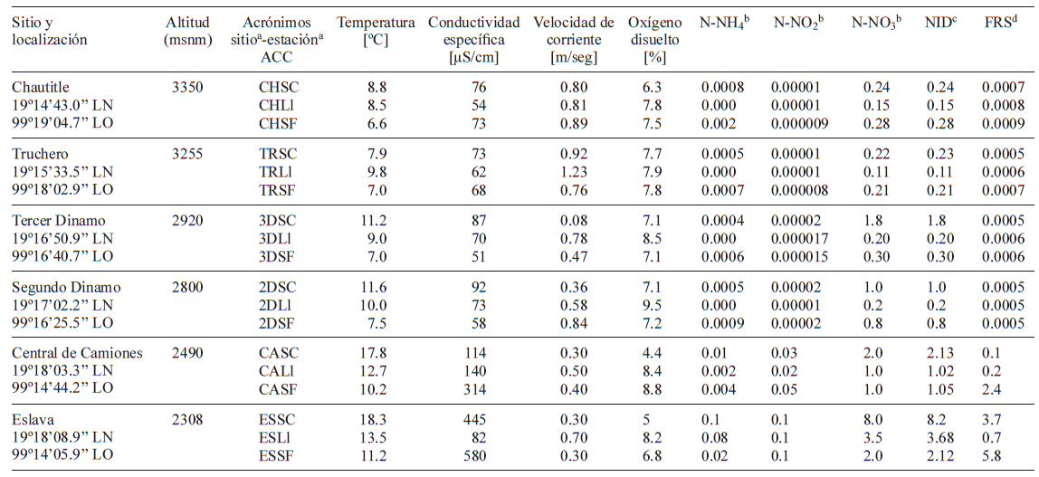 Las colectas de diatomeas y macro algas se realizaron en el periodo (mayo 2006 a enero 2007), empleando las técnicas estándares para cada grupo biológico de Bojorge-García (2006) y de Necchi et al. (1995). Encada sitio se registraron los siguientes parámetros físicos y químicos: la temperatura del agua (ToC) y la conductividad específica (normalizada a 25 ºC, K25) fueron estimadas con un medidor de PC-18Conductronic (Puebla, México). El oxígeno disuelto (OD) se determinó con un medidor YSI-85 (YSI Environmental, Massachusetts, EUA). Los nutrientes disueltos tales como el fósforo reactivo soluble (FRS),los nitritos (N-NO2), los nitratos (N-NO3), el amonio(N-NH4) y el nitrógeno inorgánico disuelto (NID) se estimaron a partir de 30 mL de muestras de agua. Estas muestras se filtraron in situ con membranas de 0.45 y0.22 μm de diámetro de poro y fueron preservadas con cloroformo y en congelación hasta que los análisis se realizaron en el laboratorio con un analizador de flujo segmentado (Skalar Inc., Georgia, USA), de acuerdo con la norma ASTM (1989) y APHA (1995).