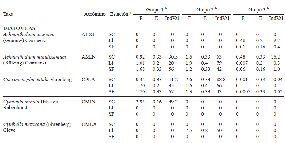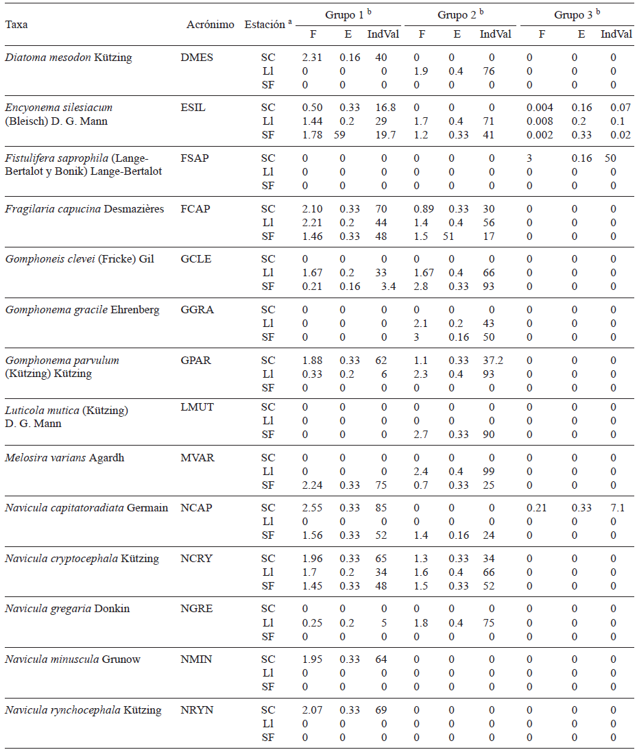 El IndVal de las diatomeas. Se reconocieron 28especies con un alto valor indicador (≥ 50 %), las cuales fueron características de los grupos altamente contaminados, o bien, del grupo que presentó agua sin rastros de perturbación humana (Cuadro II).Se identificó un efecto estacional sobre el IndVal de las especies, en el periodo seco cálido (SC) sepresentó el mayor número de especies con un alto valor indicador, mientras que el menor número de especies y menor IndVal estuvo relacionado con la época de lluvia (Ll). Las especies con el mayor IndVal promedio del G1 (Fragilaria capucina, Navicula capitatoradiata, Navicula minuscula, Navicularynchocephala, Nitzschia incospicua y Staurosirellapinnata; Cuadro II) mostraron preferencia por aguas oligotróficas y una alta especificidad. Las especies del G2 Achnanthidium minutissimum, Diatoma mesodon,Encyonema silesiacum, Gomphoneis clevei, Gomphonemagracile, Gomphonema parvulum, Luticolamutica, Melosira varians, Navicula cryptocephala,Navicula gregaria, Rhoicosphaenia abbreviata yUlnaria ulna (Cuadro II), presentaron preferenciapor aguas oligotróficas pero tolerantes a la presenciade NID y FRS en alguna época del año. Finalmente,las especies del G3 Fistulifera saprofila, Nitzschiaminuta, Nitzschia palea y Nitzschia recta fueronespecíficas de los sitios de la zona urbana con altacontaminación (CA y ES).