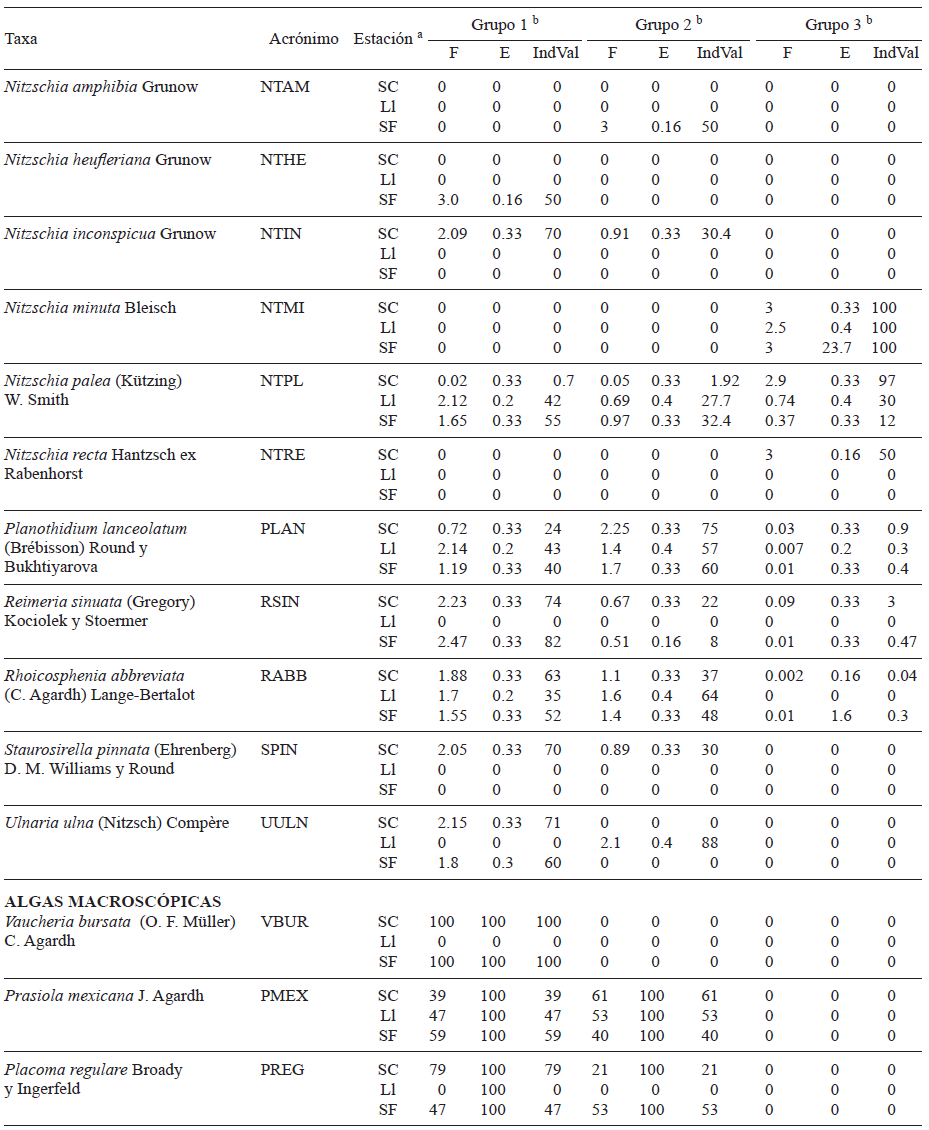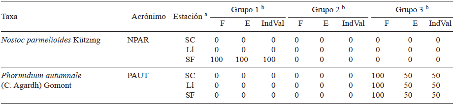 El IndVal de las algas con crecimiento visible. Las cinco especies registradas en el estudio: Vaucheria bursata, Prasiola mexicana, Placoma regulare, Nostoc parmelioides y Phormidium autumnale presentaron un alto IndVal (> 50 %), y fueron características del grupo de sitios altamente contaminados (G3) como Phormidium autumnale, o bien, del grupo que presentó agua sin rastros de perturbación humana (G1) como Vaucheria bursata y Nostoc parmelioides (Cuadro II). El periodo seco cálido (SC) presentó el mayor número de especies con un alto valor indicador (> 50 %), mientras que el menor número de especies e IndVal estuvo relacionado con la época lluviosa (Ll) (Cuadro II). Las especies con el mayor IndVal del G1 (Placoma regulare, Vaucheria bursata y Nostoc parmelioides) mostraron una preferencia por aguas oligotróficas y una alta especificidad (CH y TR). Se reconoció una especie detectora, Prasiola mexicana, que mostró un IndVal variable y una preferencia por agua oligotrófica, aunque puede ser tolerante a la presencia de NID y FRS (presente en G1 y G2). Finalmente, el G3 formado por Phormidium autumnale, fue específico de los dos sitios de la zona urbana con alta concentración de nutrientes (CA y ES).