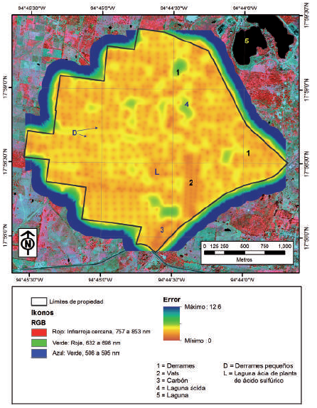La plicación de kriging en el programa ArcGIS produce además un archivo que contiene la "predicción de la varianza". Asumiendo que los errores están distribuidos normalmente, hay una probabilidad de 95.5 % de que el valor calculado de z (el parámetro de pH) en la celda es el valor predicho, más o menos dos veces la raíz cuadrada del valor en el archivo de predicción resultante. La Figura 9 muestra el resultado de este cálculo. Hay que señalar varios puntos respecto de este resultado: a) las desviaciones más altas están en la periferia de la zona, el algoritmo carece de datos en la zona exterior al límite de propiedad y entonces la incertidumbre en la interpolación es mayor, ésto es una ocurrencia común y puede resolverse al obtener puntos de muestreo por afuera de los límites de la zona de estudio. Lo anterior no fue posible dado que el predio estudiado estaba rodeado de terrenos de propiedad privada y no se permitió el acceso a ellos; b) dentro de la zona de estudio la incertidumbre aumenta en aquellas áreas en donde no hay puntos de muestreo, por ejemplo en la laguna que drena la zona de vats (Fig. 9, zona marcada con el número 4) o los sedimentos al norte de la misma laguna (Fig. 9, marcados con el número 1, que no fue posible muestrear ya que este sitio permaneció inundado durante el trabajo de campo) o algunos sitios no contaminados pero con vegetación muy cerrada que impedía el acceso a esas áreas; c) se observa también un efecto de "moteado" ya que el error es comparativamente menor en donde se localizan los puntos empleados para la interpolación.
