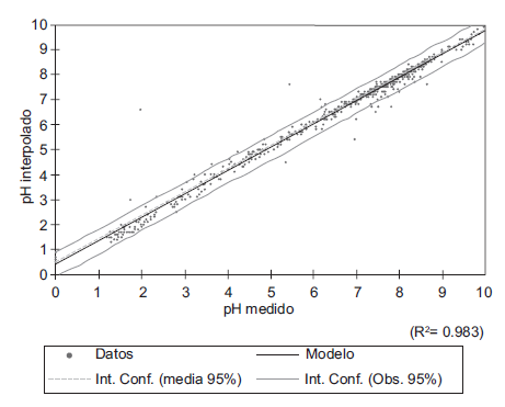 Los valores de pH obtenidos en el laboratorio oscilan de 1.2 a 10.0 y presentan una variación espacial relativamente suave, por lo que el algoritmo de kriging produjo mejores resultados de interpolación. Los resultados de correlación entre los datos medidos y los datos interpolados es de R = 0.983 (Fig. 10).