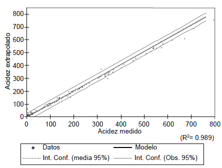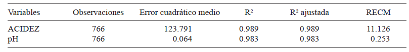 A diferencia del pH, los valores de acidez tienen una variación amplia (de 1.69 a 800 cmol/kg), lo que hace que el algoritmo de kriging produzca resultados poco adecuados (muy "suavizados"), suprimiendo los "picos y valles" presentes en los datos puntuales. El algoritmo IDW produce mejores resultados ya que usa una combinación lineal ponderada del conjunto de puntos empleados en el cálculo. La superficie resultante crea una representación más adecuada de los valores obtenidos en el laboratorio, con una correlación de R = 0.989 (Cuadro IV y Fig. 11). El valor de RECM de los datos de acidez fue de 11.126, este valor está afectado por los puntos que se desvían de la línea de regresión calculada con una R2 de 0.989.