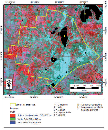 La imagen de satélite Ikonos (multiespectral y pancromática) se georreferenció empleando puntos de control GPS identificados en campo. La Figura 2 muestra la imagen multiespectral con la ubicación de varios rasgos importantes dentro y fuera de la propiedad de la mina. Los derrames de azufre y los suelos desnudos se muestran de color cian (# 1 y # 2 en la imagen), el depósito de carbón y azufre aparece con tonos grises (# 3), mientras que las lagunas aparecen en colores azul oscuro-negro (# 4 y # 5).