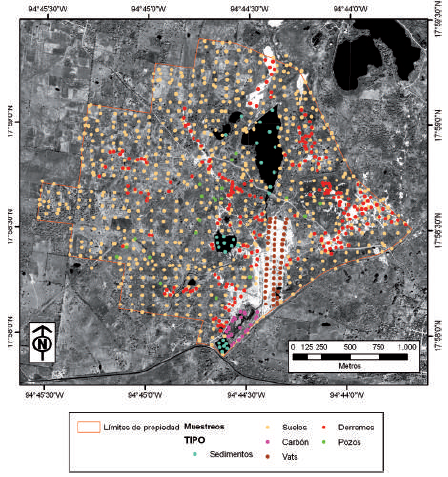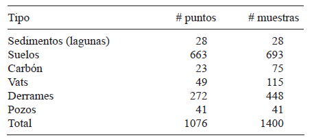 Se obtuvieron un total de 1400 muestras en 1076 puntos para los distintos tipos de condiciones identificadas en campo (Cuadro II). El diseño inicial (previo a la obtención de la imagen satelital) contempló abarcar un punto por hectárea. Una vez que se tuvo la imagen se agregaron puntos de muestreo correspondientes a sitios identificados como "derrames", "pozos" y "carbón" (Fig. 3, Cuadro II).