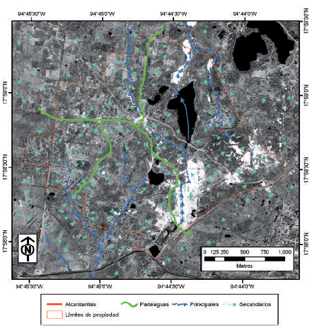 La Figura 6 muestra el resultado final de la cartografía de la red hidrológica. La información permitió identificar la dirección básica del flujo de agua para posteriormente definir el sitio más adecuado para almacenar los residuos de la remediación del sitio. Se observan dos direcciones principales en el flujo de agua. La primera es hacia el norte, en dirección al río Chacalapa (fuera de la zona de estudio) y la segunda hacia el sur, cruzando la carretera México. 180 a través de un ducto localizado a 650 m al oeste del acceso principal de la mina.