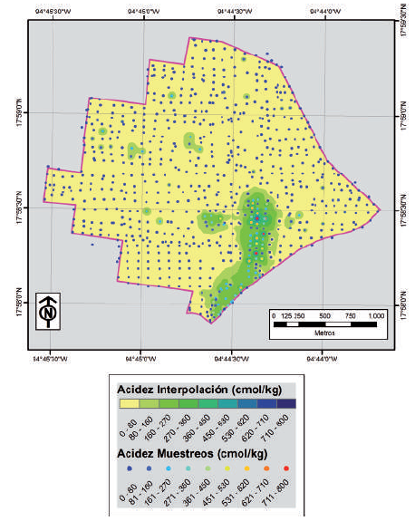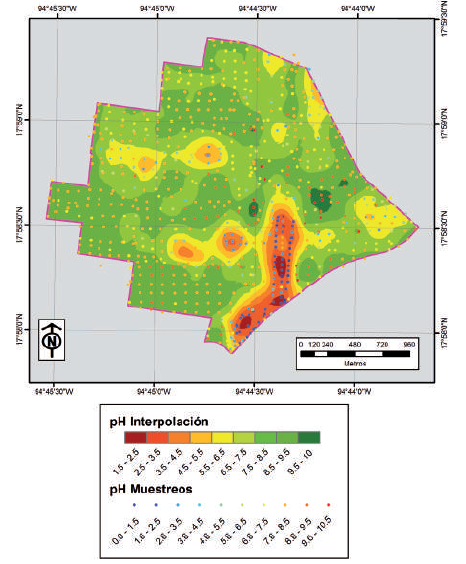 Una de las características del interpolador IDW es que requiere una nube de puntos lo suficientemente densa para mostrar la variabilidad en el terreno (condición alcanzada en este trabajo dado el número de puntos muestreado). Dado que la importancia o peso de un punto en la interpolación es isotrópica, la influencia de un punto en el valor interpolado está en función de las distancias entre éstos. Una de las características del algoritmo IDW es que no genera crestas en las superficies provenientes de la interpolación y dado el rango de valores de los datos de acidez, era necesario evitar este efecto, ya que se habrían obtenido (en la capa resultante) datos que estarían muy por encima o abajo de las mediciones obtenidas en el laboratorio.